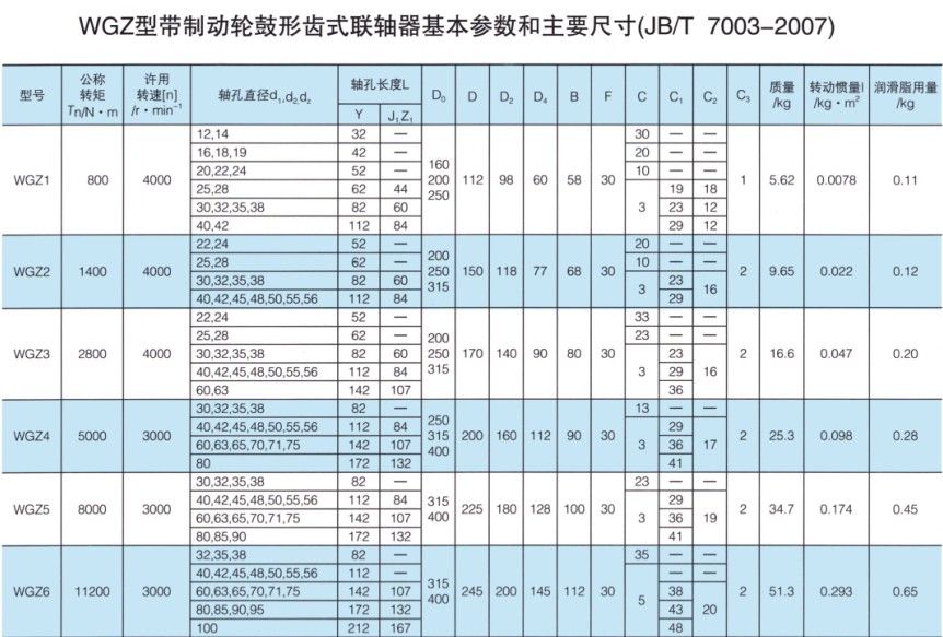 WGZ帶制動輪鼓形齒式聯軸器的參數及尺寸:(JB/T 7003-2007) mm