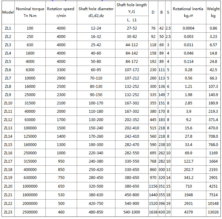 ZL (LZ) type pin gear coupling characteristics and application: It can compensate the relative offset of two axes, the vibration damping function is poor, the transmission precision is low, the transmission torque is large, and the structure is simple compared with the gear coupling. , light weight, easy to manufacture, easy to maintain. It does not need lubrication, and partially replaces the gear coupling. It has high noise and is suitable for large and medium torque shaft drive. It is not suitable for the parts with high requirements for vibration reduction and strict control of noise. ZL type - basic type; ZID type - tapered hole type (connected to the motor); ZLZ type - connected to the intermediate shaft type; ZLL type - with brake wheel type; ![]() ![]() |