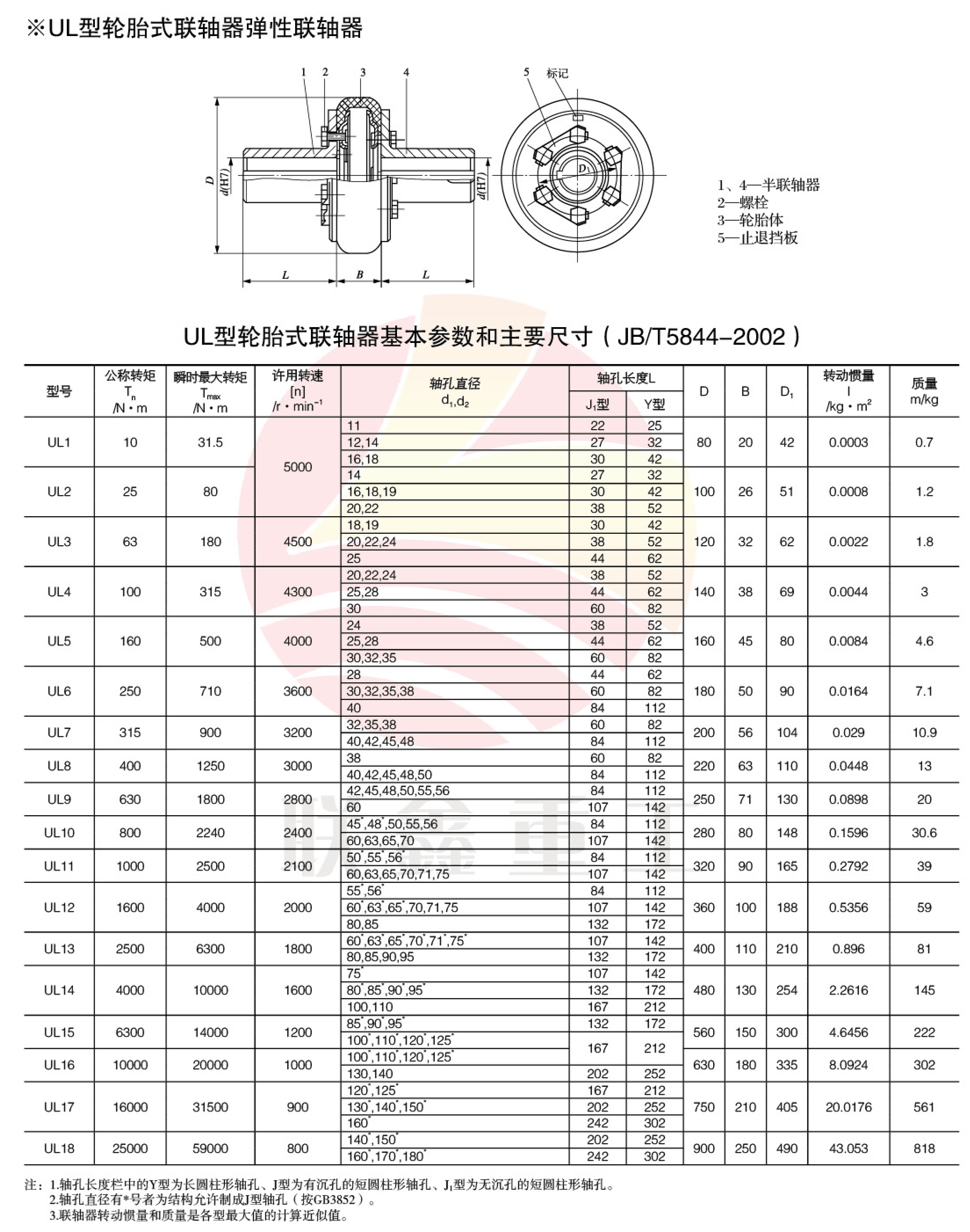UL型輪胎式聯軸器 特點及應用場合:有較高彈性,扭轉剛度小,減振能力強,補償量較大,有良好的阻尼,結構簡單,不用潤滑,裝拆維護方便.噪聲小,徑向尺寸大,承載能力低,過載時產生較大軸向附加載荷,使用壽命取決于橡膠產品質量,適用于起動頻繁,正反轉多變、沖擊振動較大的軸系傳動,可在有粉塵、水份工況環境下工作,不適用于高溫、高速、大轉矩和低速重載工況條件。