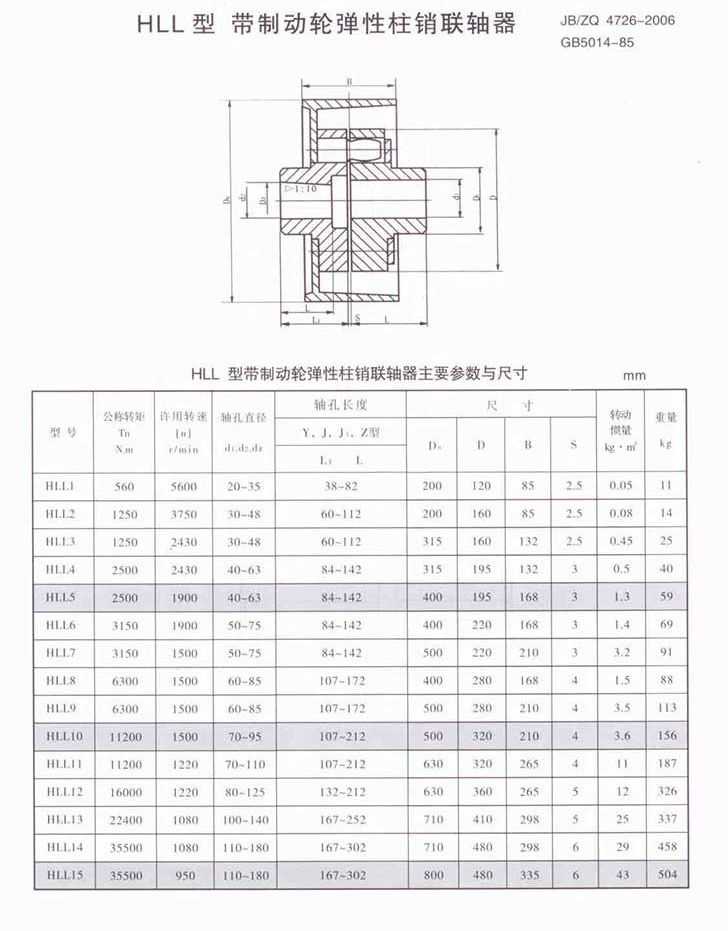HL,HLL(LX,LXZ)彈性柱銷聯軸器 特點及應用場合:具有微量補償性能,結構簡單,容易制造,更換柱銷方便,可靠性差,適用于有軸向竄動,起動頻繁,正反轉的軸系傳動,不適用于工作可靠性要求精度高的部位,不宜用于高速、重載及有強烈沖擊振動的軸系傳動,安裝精度低的軸系亦不應選用。